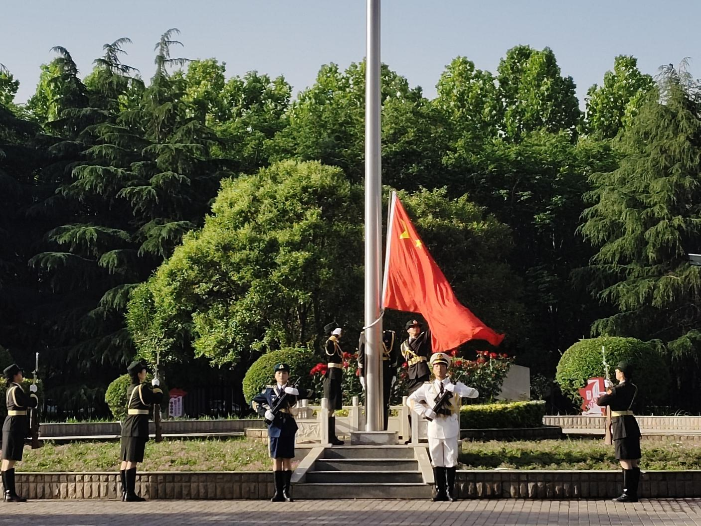 清晨七点,晨光初绽。国旗护卫队的同学们身着笔挺制服,以铿锵有力的步伐,护送五星红旗迈向升旗台。在庄严的国歌声中,五星红旗迎着晨光缓缓升起,迎风飘扬。全体师生神情肃穆,整齐列队,向国旗行注目礼,将对祖国的热爱与敬意融入这庄重的时刻。