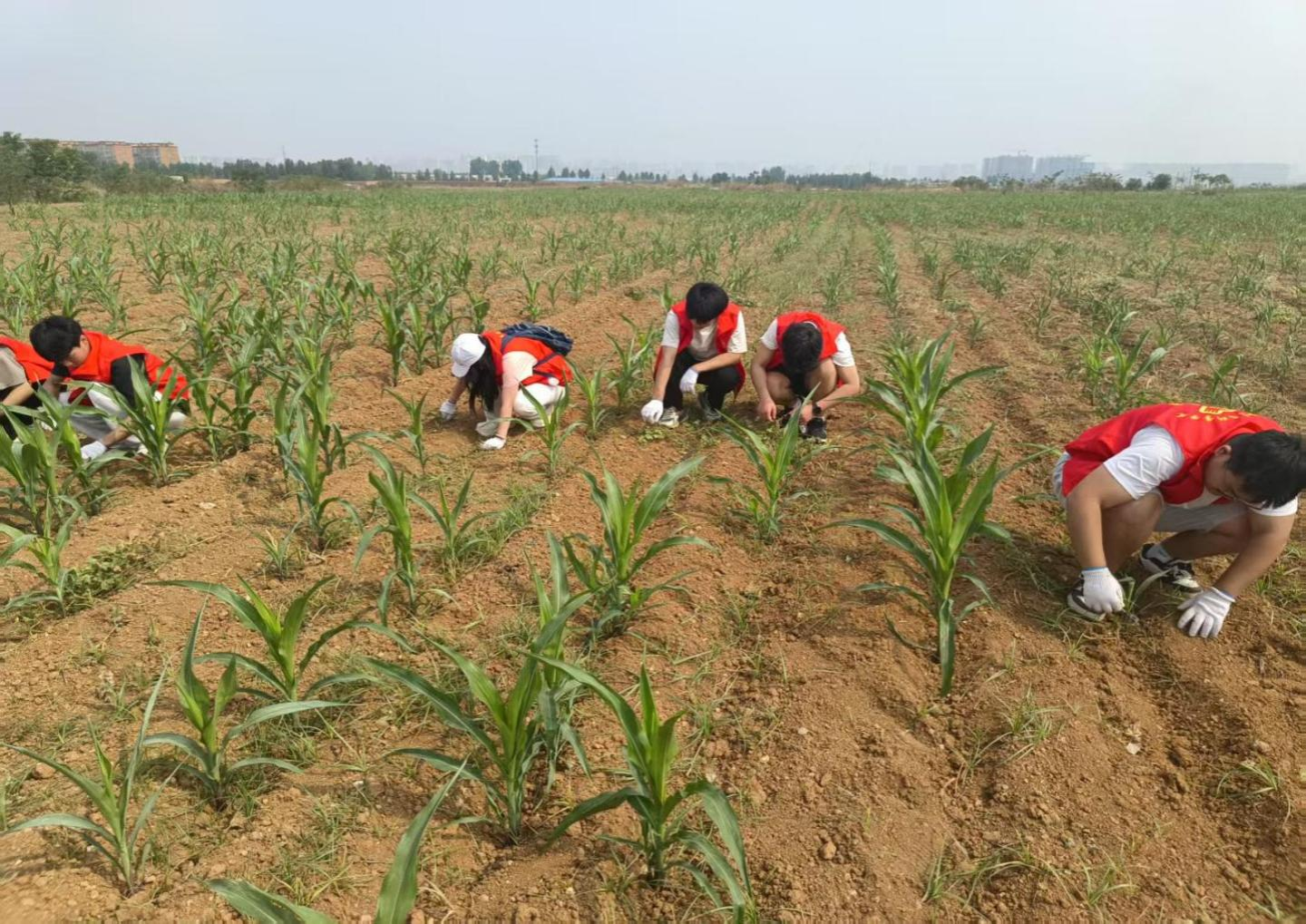 当天上午,队员们身着红色志愿服,来到了下毛仪涧村玉米地,以炽热之心投身助农实践。大家分工协作,高效除草助力作物生长。夏日的阳光炽热,却挡不住队员们的热情,手中的工具快速挥动,将田间杂草一一清除,让农作物可以更好地汲取养分。